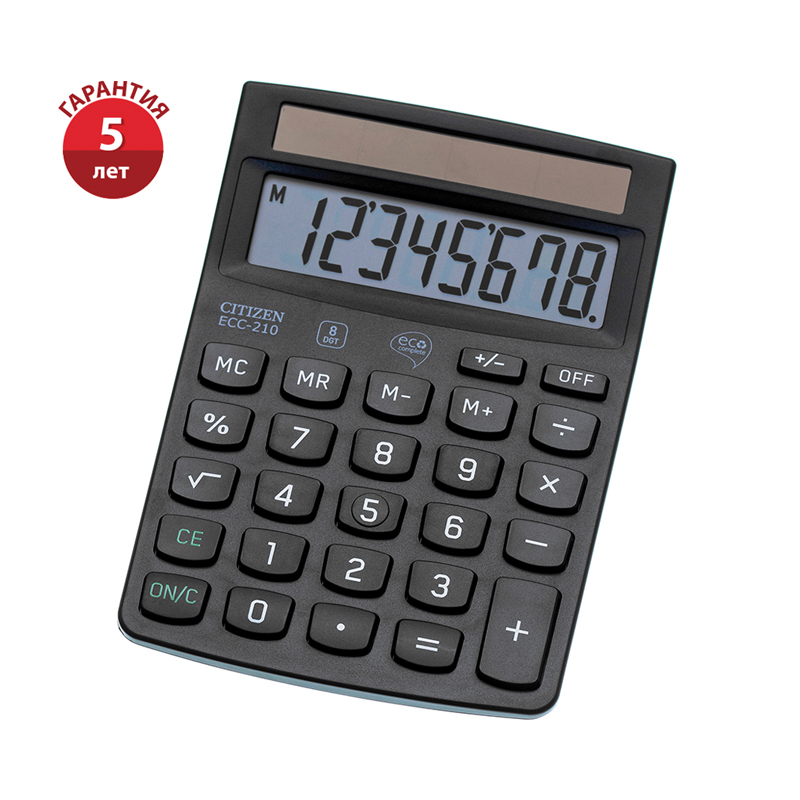 Калькулятор настольный Citizen ECC-210, 8 разрядов, питание от солнечной батареи, 102*144*31мм, черный