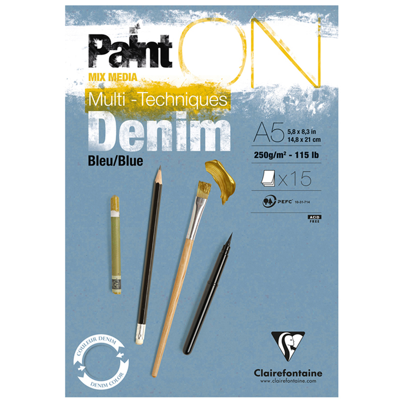 Скетчбук - альбом для смешанных техник 15л., А5 Clairefontaine "Paint ON Denim Blue", на склейке, джинсовый, 250г/м2