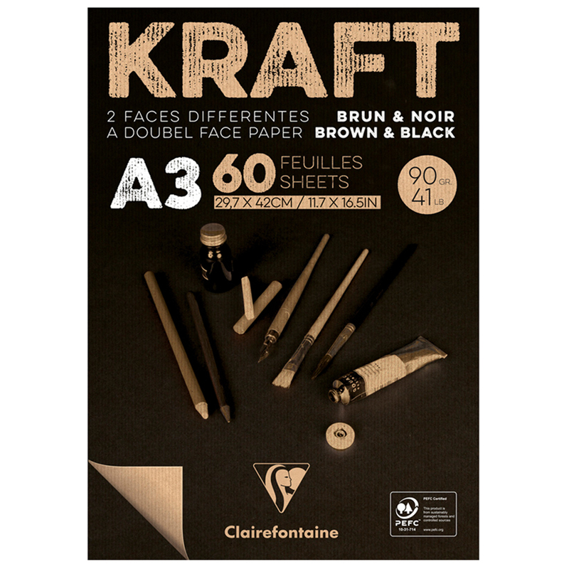 Скетчбук - блокнот 60л., А3, Clairefontaine "Kraft", на склейке, верже,черный/крафт, 90г/м2