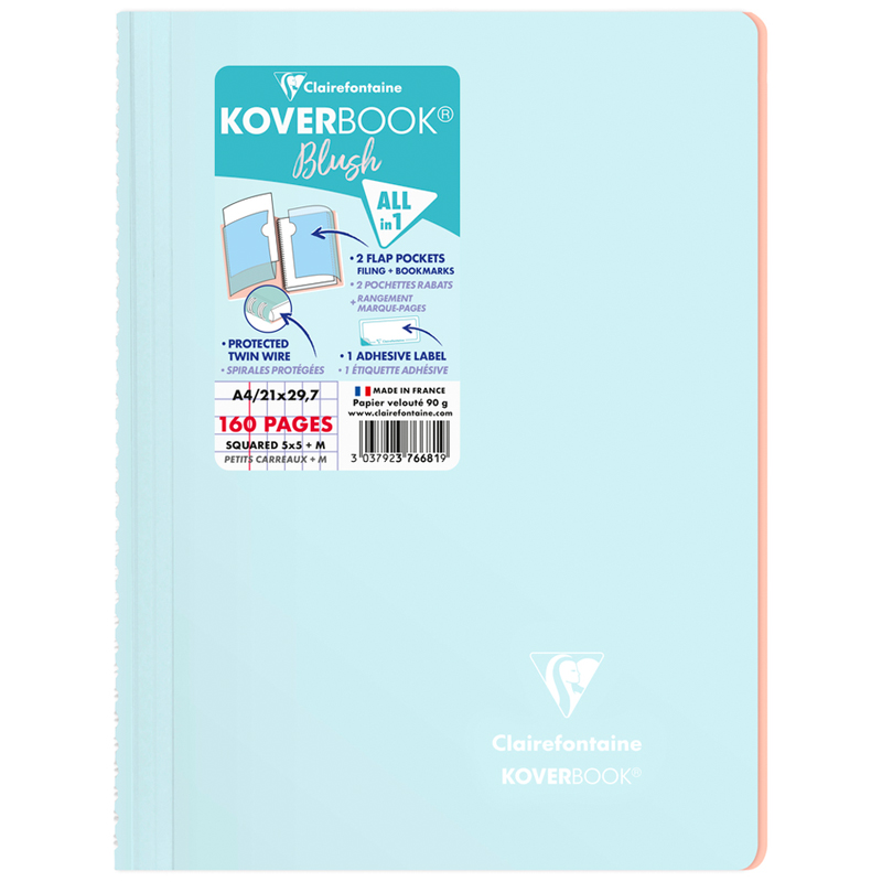 Тетрадь 80л., А4, клетка на гребне Clairefontaine "Koverbook Blush", пластиковая обложка, голубая, 90г/м2