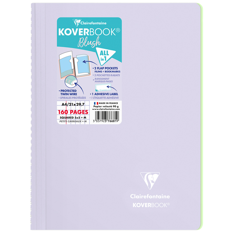 Тетрадь 80л., А4, клетка на гребне Clairefontaine "Koverbook Blush", пластиковая обложка, сиреневая, 90г/м2