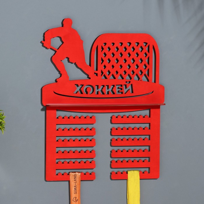 Медальница с полкой "Хоккей" красный цвет, 42,5х27,5 см