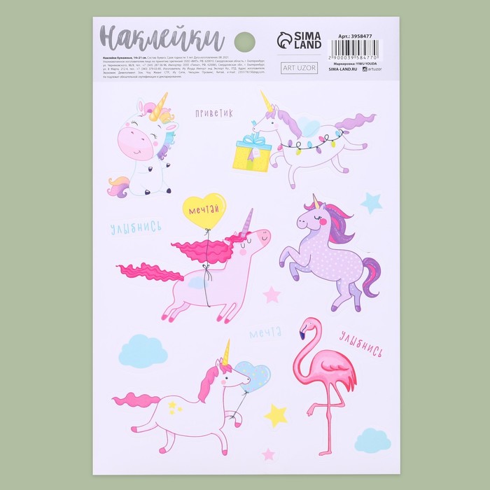 Наклейки детские бумажные «Фламинго и единороги», 14 х 21 см