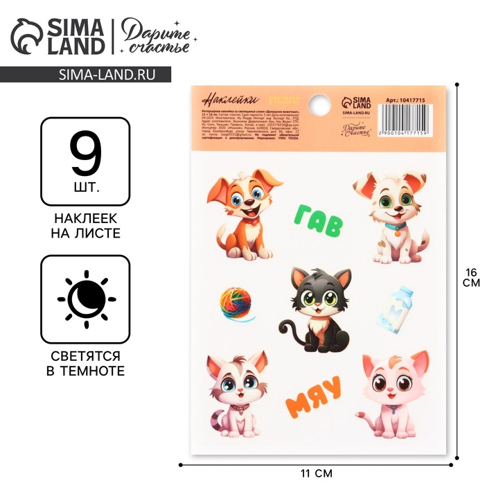 Наклейки детские со светящимся слоем «Домашние животные», 11 х 16 см