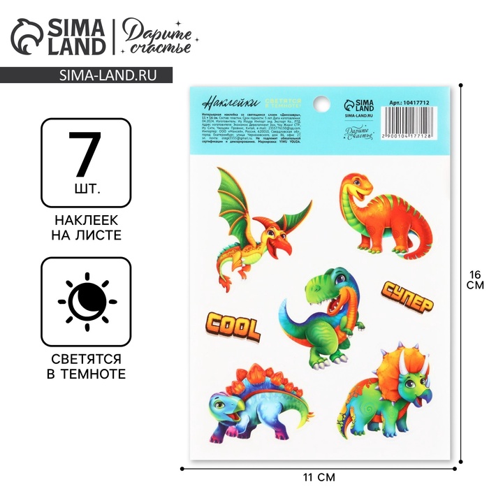 Наклейки детские со светящимся слоем «Динозавры», 11 х 16 см