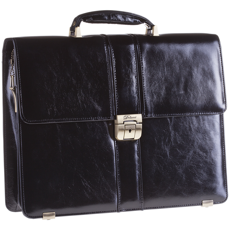 Портфель Delucci "Гиперион", кожа, черный, 2 отделения, метал. замок, с ремнем