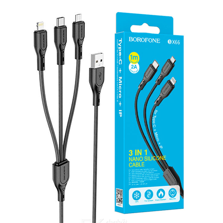 Кабель сетевой USB - Lightning, Type-C, micro USB " Earldom " EC-041IMC чёрный, круглый, 1,2м, 3,1А, силикон