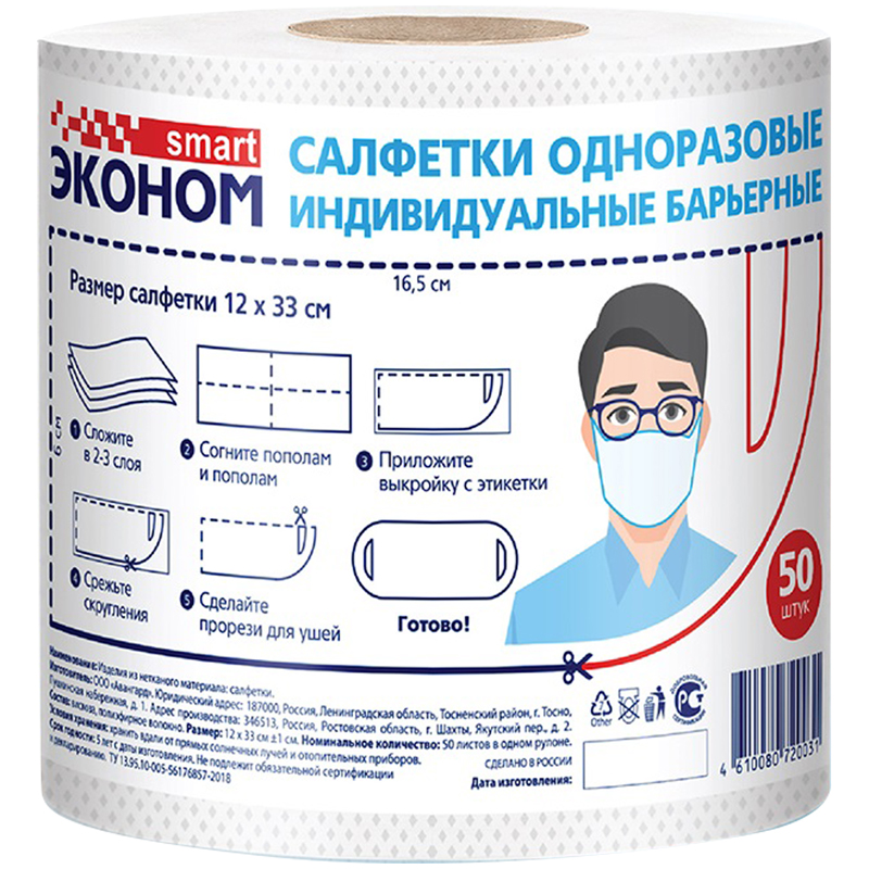 Маска-салфетка индивид. защиты одноразовая Эконом Smart, с прорезью под уши, спанлейс, 40 г/м кв., 50 шт, рулон