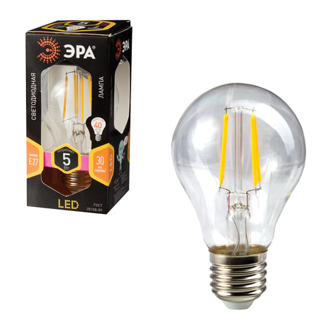 Лампа светодиодная филаментная ЭРА, 5 (40) Вт, цоколь E27, груша, теплый белый свет, 30000 ч., F-LED А60-5w-827-E27