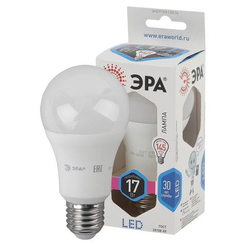 Лампа светодиодная ЭРА, 17 (145) Вт, цоколь E27, груша, нейтрал. белый, 25000 ч, smdA60-17w-840-E27