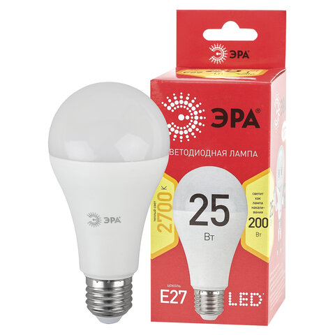 Лампа светодиодная ЭРА, 25(200)Вт, цоколь Е27, груша, теплый белый, 25000 ч, LED A65-25W-2700-E27, Б0048009