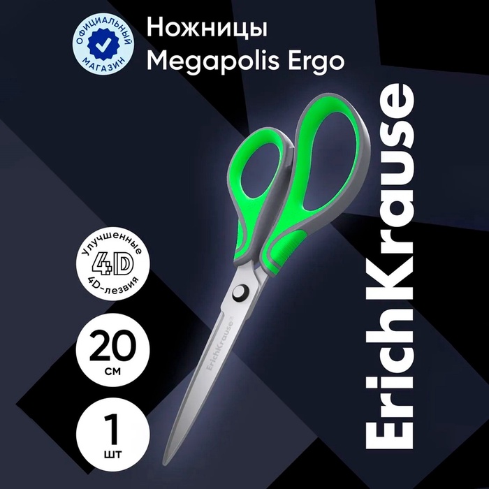 Ножницы Erich Krause Megapolis Ergo, 20 см, с усовершенствованными 4D-лезвиями, не ржавеют, ручки с резиновыми вставками, в блистере