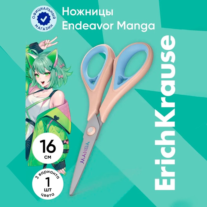 Ножницы ErichKrause Endeavor Manga, 16 см, двойная заточка, антискользящие резиновые вставки, европодвес, МИКС