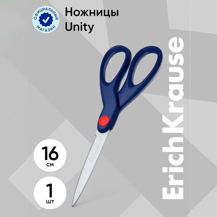Ножницы ErichKrause Unity, 16 см, лезвия из нержавеющей стали, дугообразная форма, ударопрочный пластик, синие, блистер