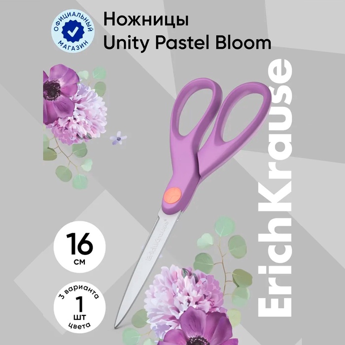 Ножницы ErichKrause Unity Pastel Bloom, 16 см, лезвия из нержавеющей стали, двойная заточка, ударопрочный пластик, блистер, МИКС