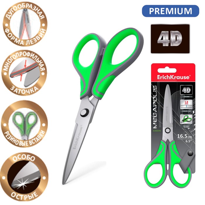 Ножницы ErichKrause Megapolis, 16.5 см, с усовершенствованными 4D-лезвиями, не ржавеют, ручки с резиновыми вставками, в блистере