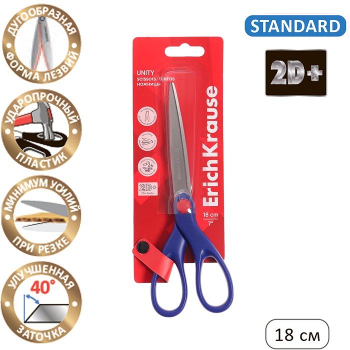 Ножницы ErichKrause Unity, 18 см, лезвия из нержавеющей стали, дугообразная форма, ударопрочный пластик, синие, блистер