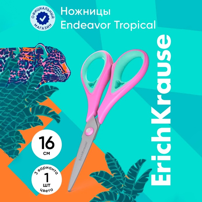 Ножницы ErichKrause Endeavor Tropical, 16 см, двойная заточка, антискользящие резиновые вставки, европодвес, МИКС