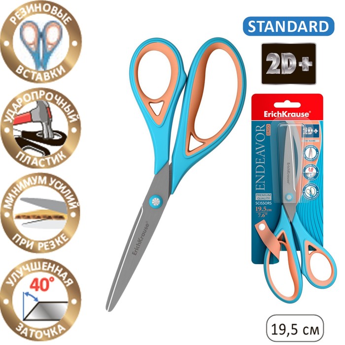 Ножницы ErichKrause Endeavor Ergo, 19.5 см, антискользящие резиновые вставки, улучшенная заточка, блистер, МИКС