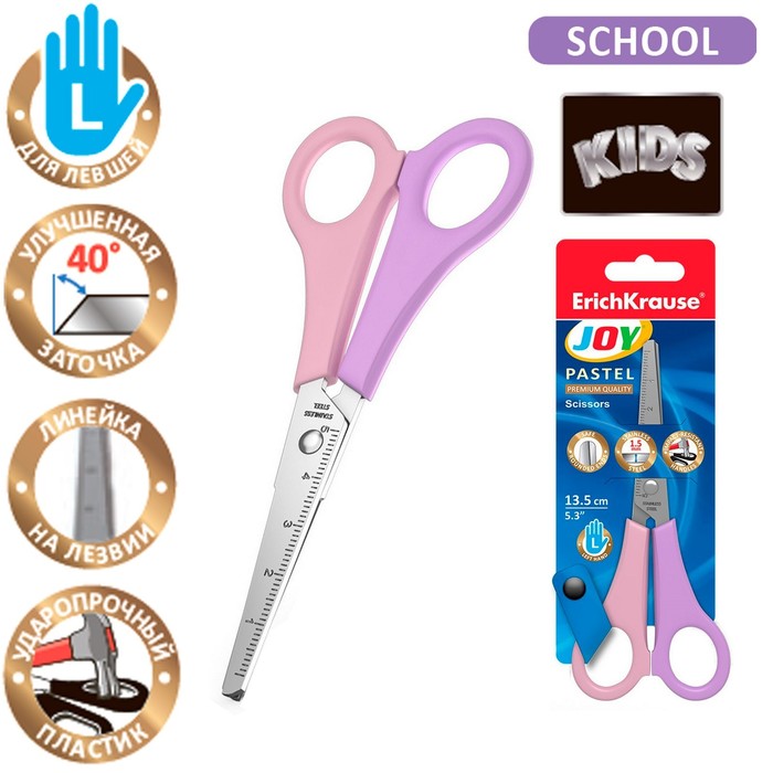 Ножницы детские для левшей 13,5 см, ErichKrause Joy Pastel, с линейкой на лезвиях, закруглённые концы, блистер