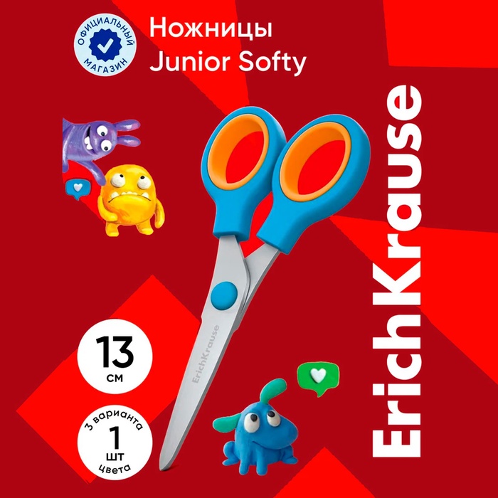 Ножницы детские 13 см ErichKrause Junior Softy Jolly Friends, закругленные концы, удобные ручки, блистер, МИКС (цена за 1 штуку)