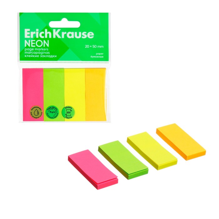Закладки с клеевым краем бумажные 20x50 мм, ErichKrause "Neon", 200 листов, 4 цвета