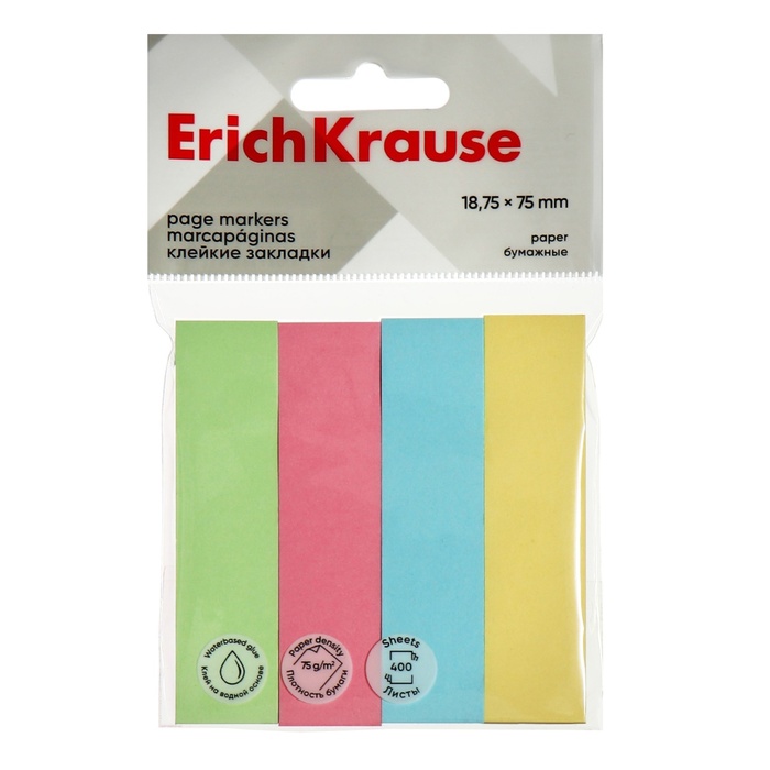 Закладки с клеевым краем бумажные 18x75 мм, ErichKrause, 400 листов, 4 цвета