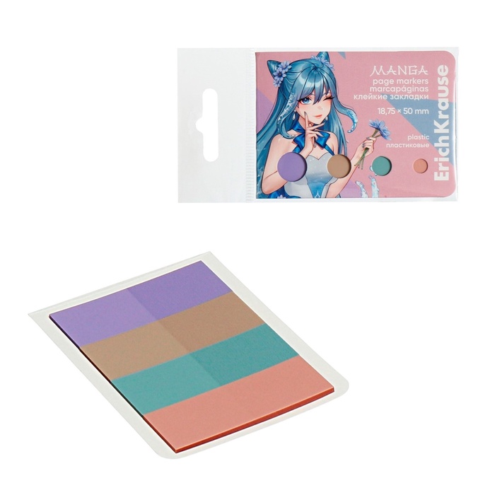 Закладки с клеевым краем пластиковые, 18x50 мм, ErichKrause "Manga", 100 листов, 4 цвета, в картонной книжке