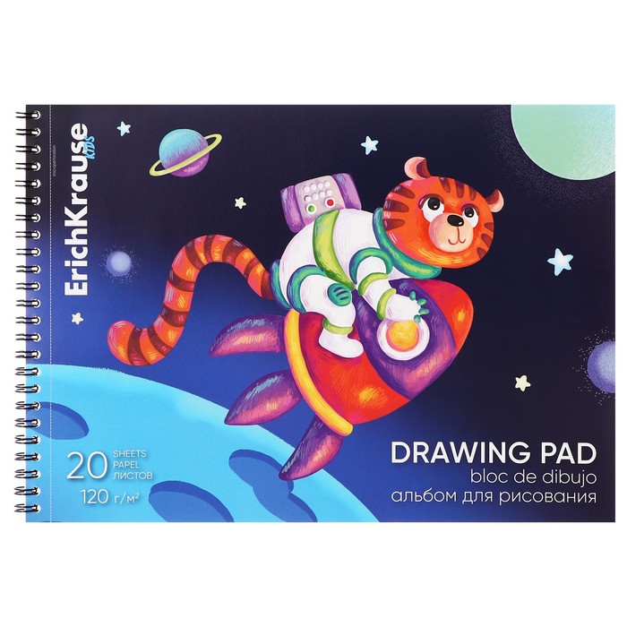 Альбом для рисования А4, 20 листов, блок 120 г/м², на спирали, Erich Krause "Space Animals", 100% белизна, перфорация на отрыв, твердая подложка