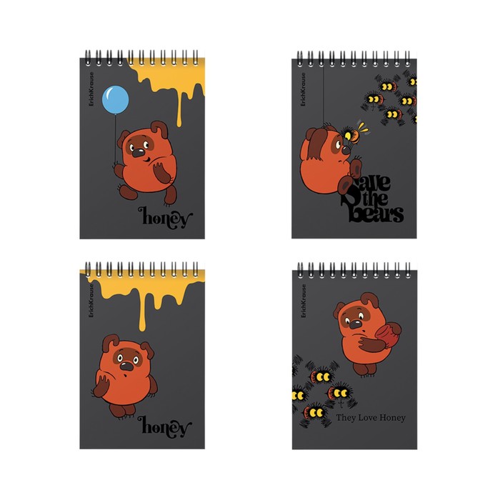 Блокнот на спирали А6, 60 листов, клетка, ErichKrause "Винни-Пух", картонная обложка, блок офсет, белизна 100%, МИКС