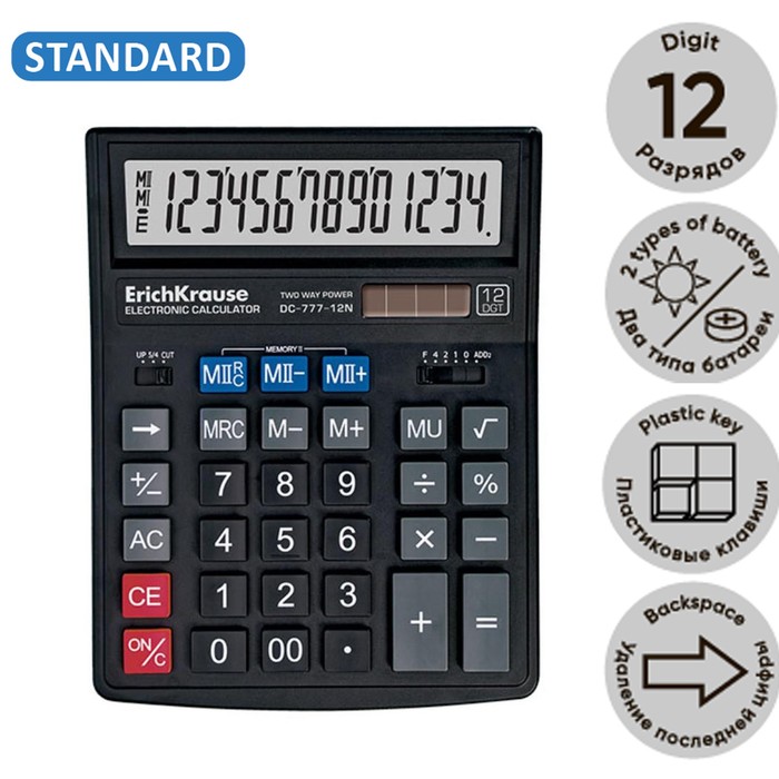 Калькулятор настольный 12-разрядный ErichKrause DC-777-12N, чёрный