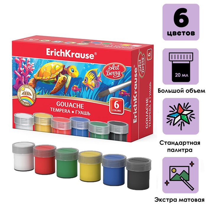 Гуашь 6 цветов х 20 мл, ErichKrause, УФ-защита яркости, в картонной упаковке