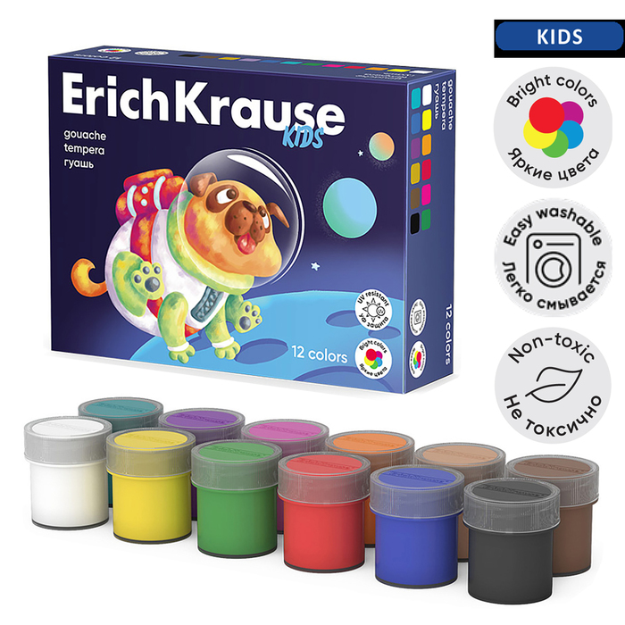 Гуашь 12 цветов х 20 мл, ErichKrause "Kids Space Animals", с УФ защитой яркости, в коробке