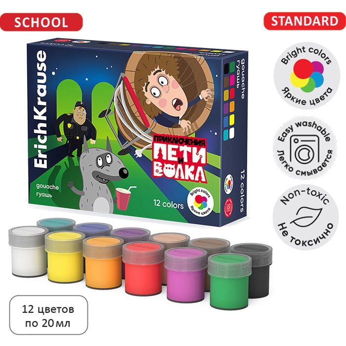 Гуашь 12 цветов по 20 мл ErichKrause "Приключения Пети и Волка", в коробке