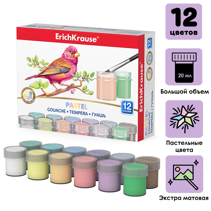 Гуашь 12 цветов по 20 мл, ErichKrause Pastel, в картонной упаковке