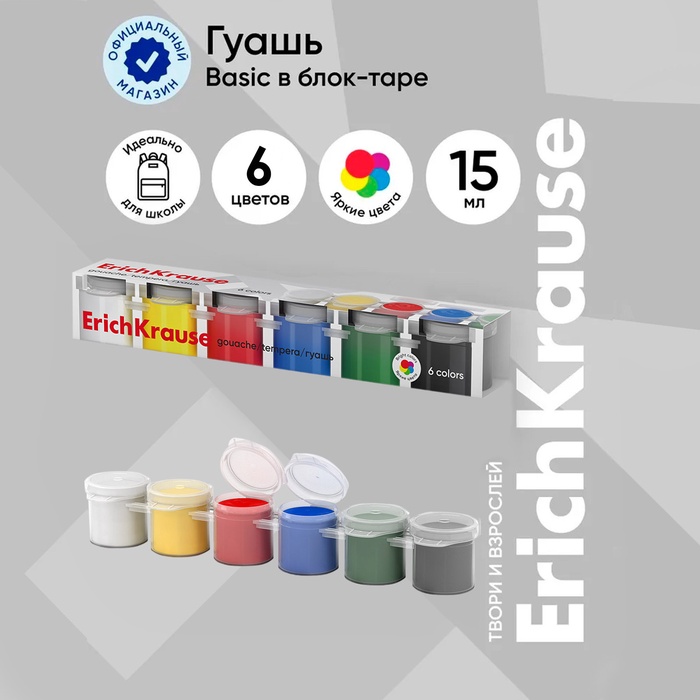 Гуашь 6 цветов х 15 мл, Erich Krause Basic, в эконом упаковке, картонный рукав