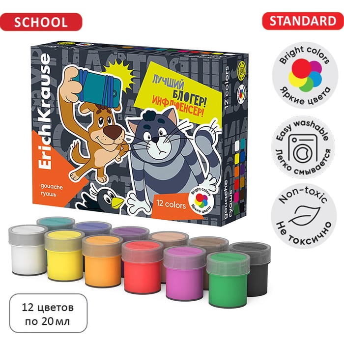 Гуашь 12 цветов по 20 мл, ErichKrause "Простоквашино", в коробке