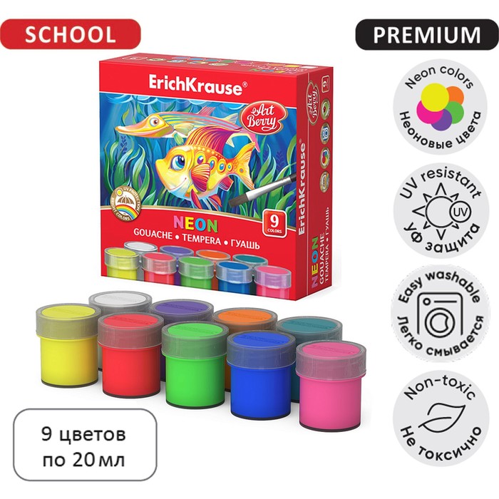 Гуашь 9 цветов по 20 мл, ErichKrause ArtBerry, неоновая, люминесцентный эффект, в картонной упаковке