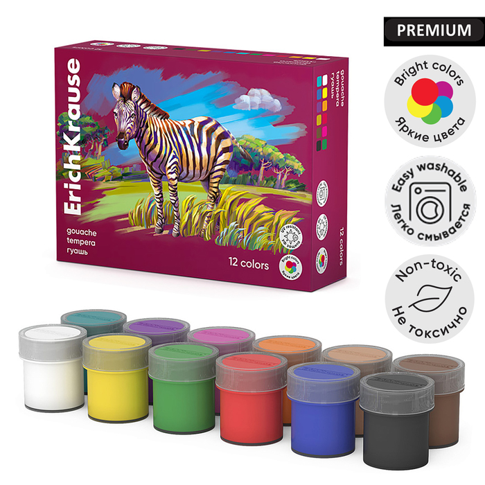 Гуашь 12 цветов х 20 мл, ErichKrause " Safari", с УФ защитой яркости, в картонной упаковке