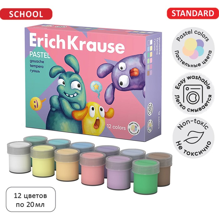 Гуашь 12 цветов х 20 мл, ErichKrause "Jolly Friends Pastel", пастельная гамма, в коробке