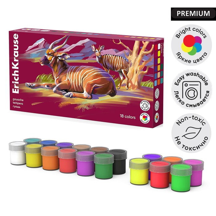 Гуашь 18 цветов по 20 мл, ErichKrause Safari, с УФ защитой яркости, в картонной упаковке