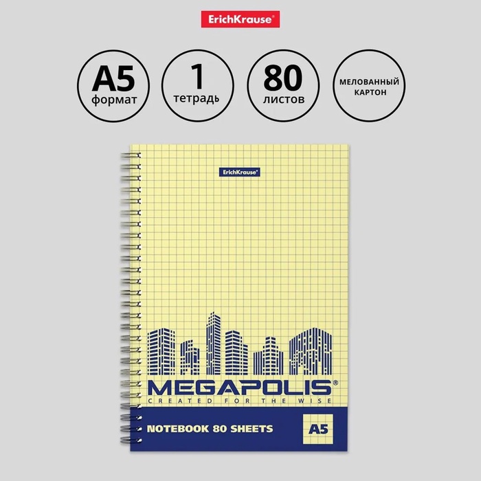 Тетрадь на спирали, 80 листов в клетку, ErichKrause Megapolis Yellow Concept, обложка мелованный картон, жёлтый внутренний блок