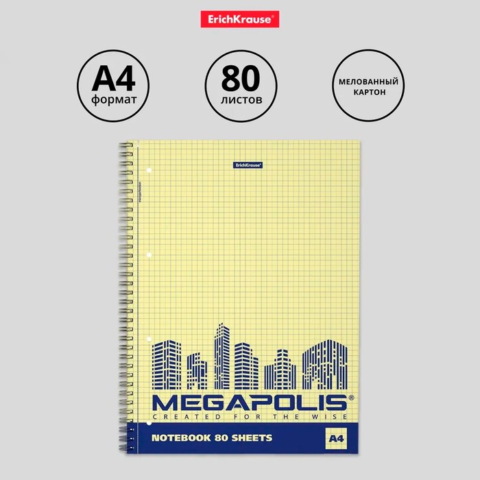 Тетрадь А4 на спирали, 80 листов в клетку, ErichKrause Megapolis Yellow Concept, обложка мелованный картон, жёлтый внутренний блок
