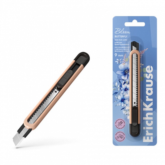 Нож канцелярский 9мм, ErichKrause "Butterfly Pastel Bloom", с автоматической фиксацией лезвия, микс