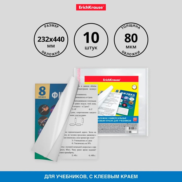 Набор обложек ПП 10 шт, 232 х 440 мм, 80 мкм, ErichKrause "Fizzy Clear", для учебников, с клеевым краем, с тиснением