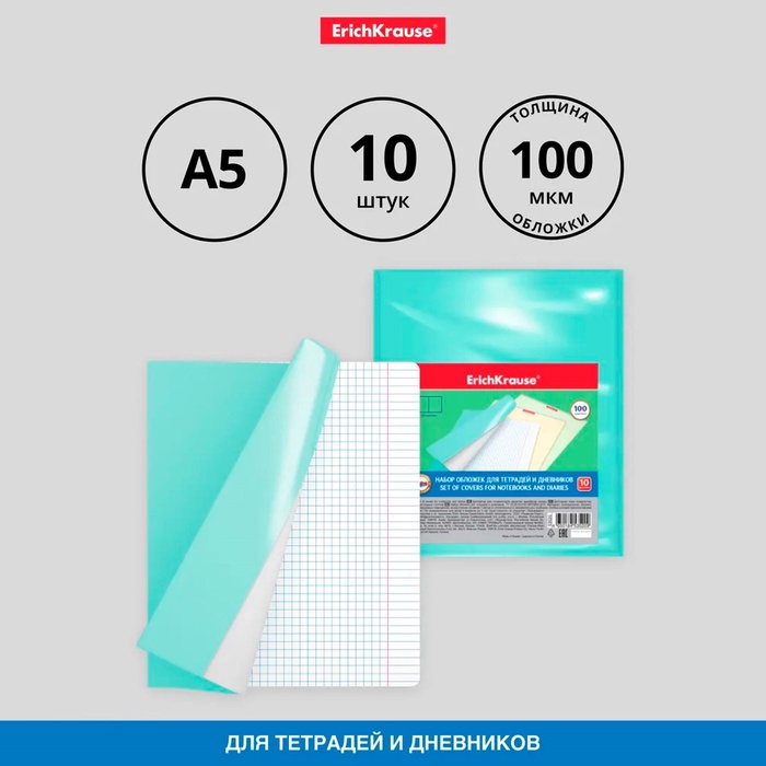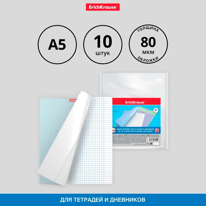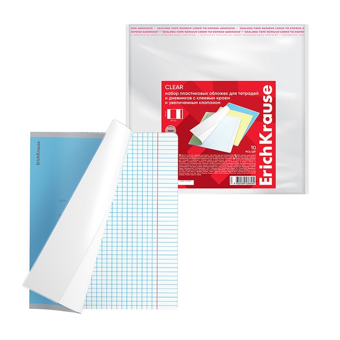 Набор обложек ПП 10 шт, 212 х 395 мм, 80 мкм, ErichKrause "Fizzy Clear", для тетрадей и дневников, с клеевым краем и увеличенным клапаном, с тиснением