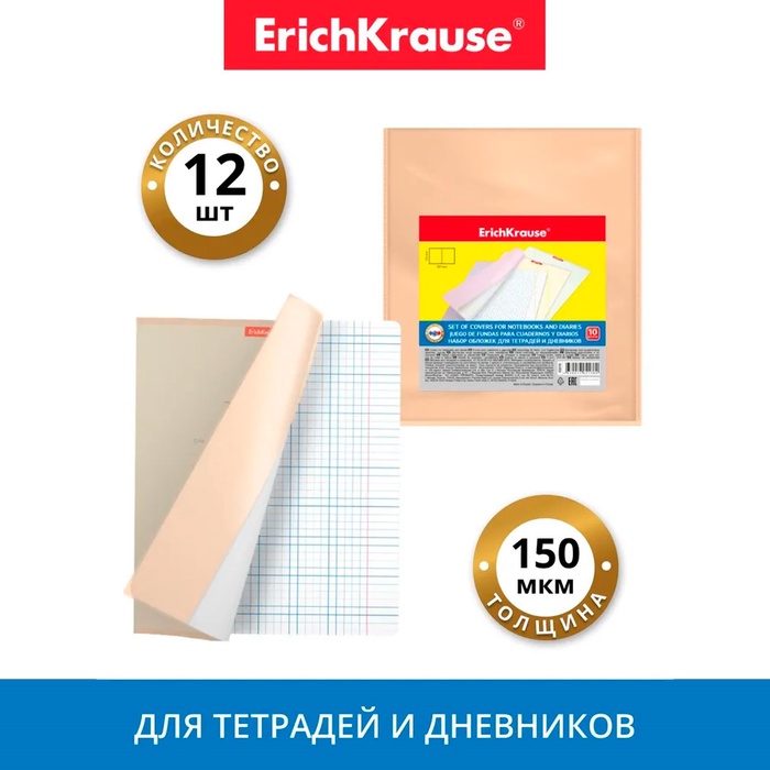 Набор обложек для тетрадей и дневников, ПП 12 шт, 212х347мм, 80 мкм, ErichKrause "Pointes", прочные швы, микс