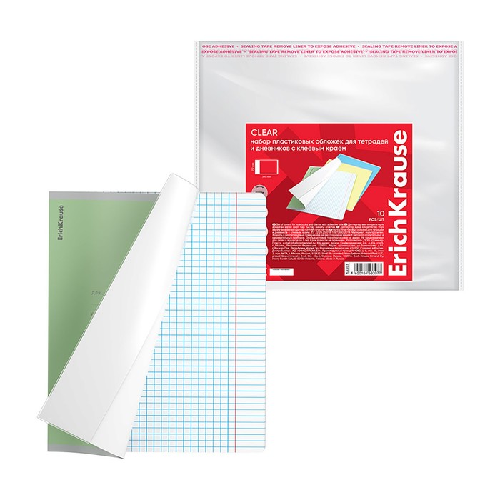 Набор обложек ПП 10 шт, 212 х 395 мм, 80 мкм, ErichKrause "Fizzy Clear", для тетрадей и дневников, с клеевым краем, с тиснением, универсальная