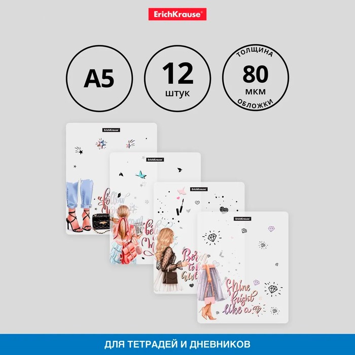 Набор обложек ПП 12 шт, 212 х 347 мм, 80 мкм, ErichKrause "Fashion Girls", для тетрадей и дневников, фиксированная, МИКС с рисунком