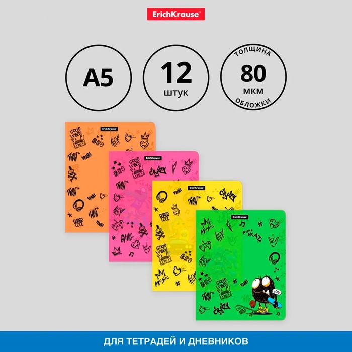 Набор обложек ПП 12 шт, 212 х 347 мм, 80 мкм, ErichKrause "Another One", для тетрадей и дневников, фиксированная, прочные швы, микс